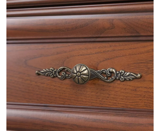 Для украшения фасада производитель использовал филенчатые вставки, фактурный карниз и металлические ручки под бронзу. Шкаф в такой отделке приобретает аристократичный вид и выглядит достойно в классическом и современном интерьере.