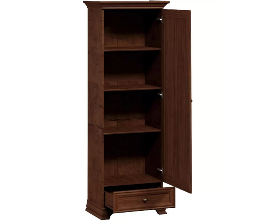Внутри установлены четыре регулируемые по высоте полки глубиной 43,5 см. Это позволит аккуратно сложить вещи без заломов и скученности. Выдвижной ящик подойдет для хранения чулочно-носочных изделий, перчаток и шарфов. Высокий шкаф Кентаки каштан можно использовать отдельно или в комбинации с другой мебелью этой коллекции (тумба, зеркало, комод).