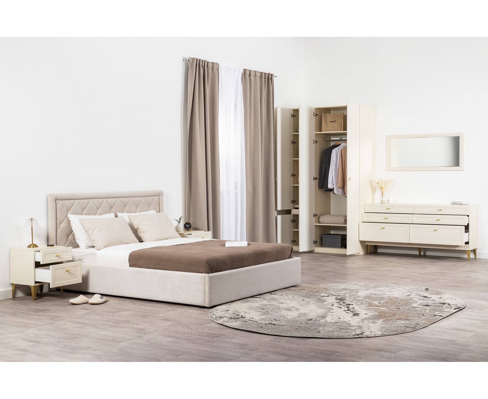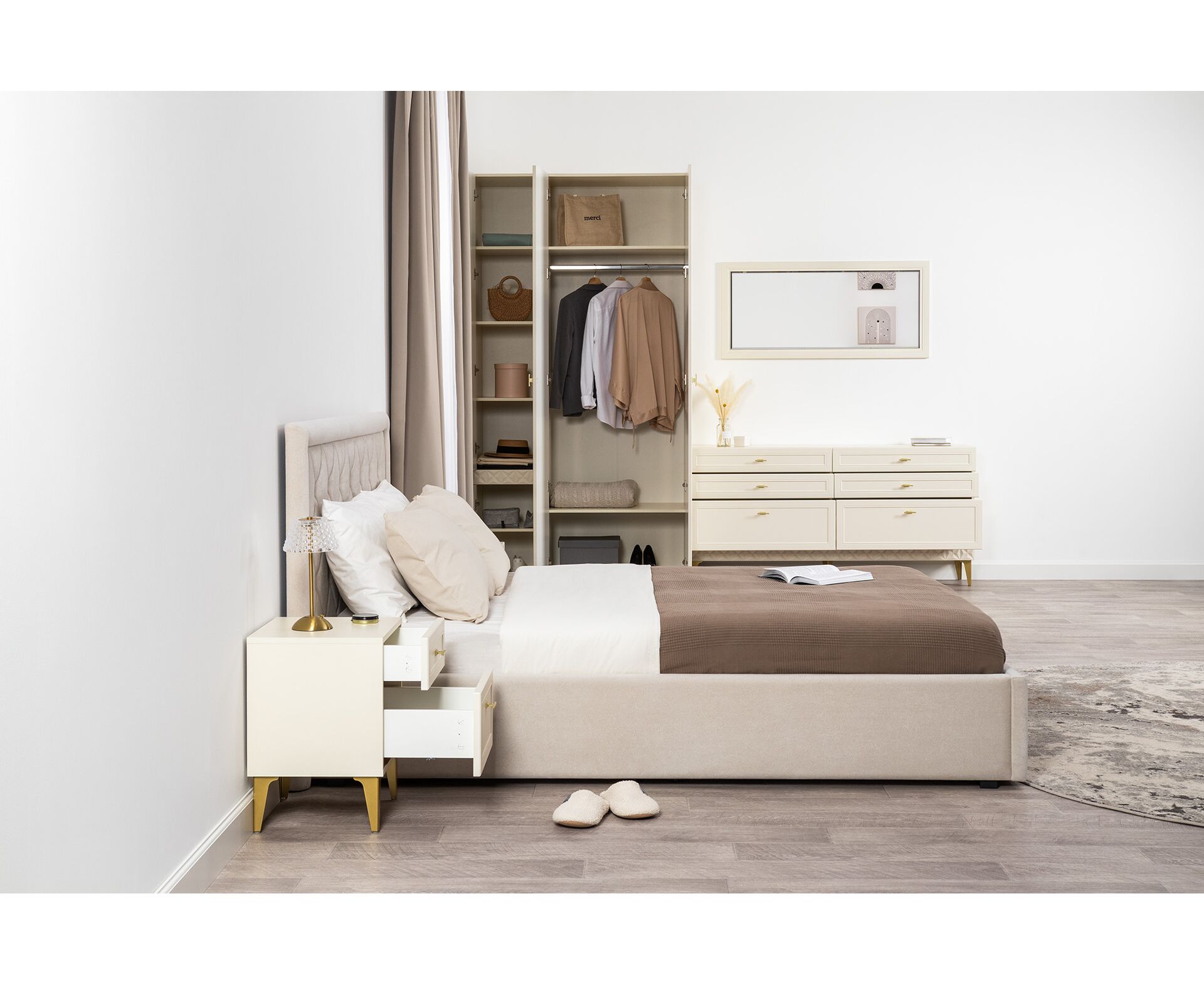 Для спальни предусмотрены гардеробная система, комоды, консольный стол и прикроватная тумба.