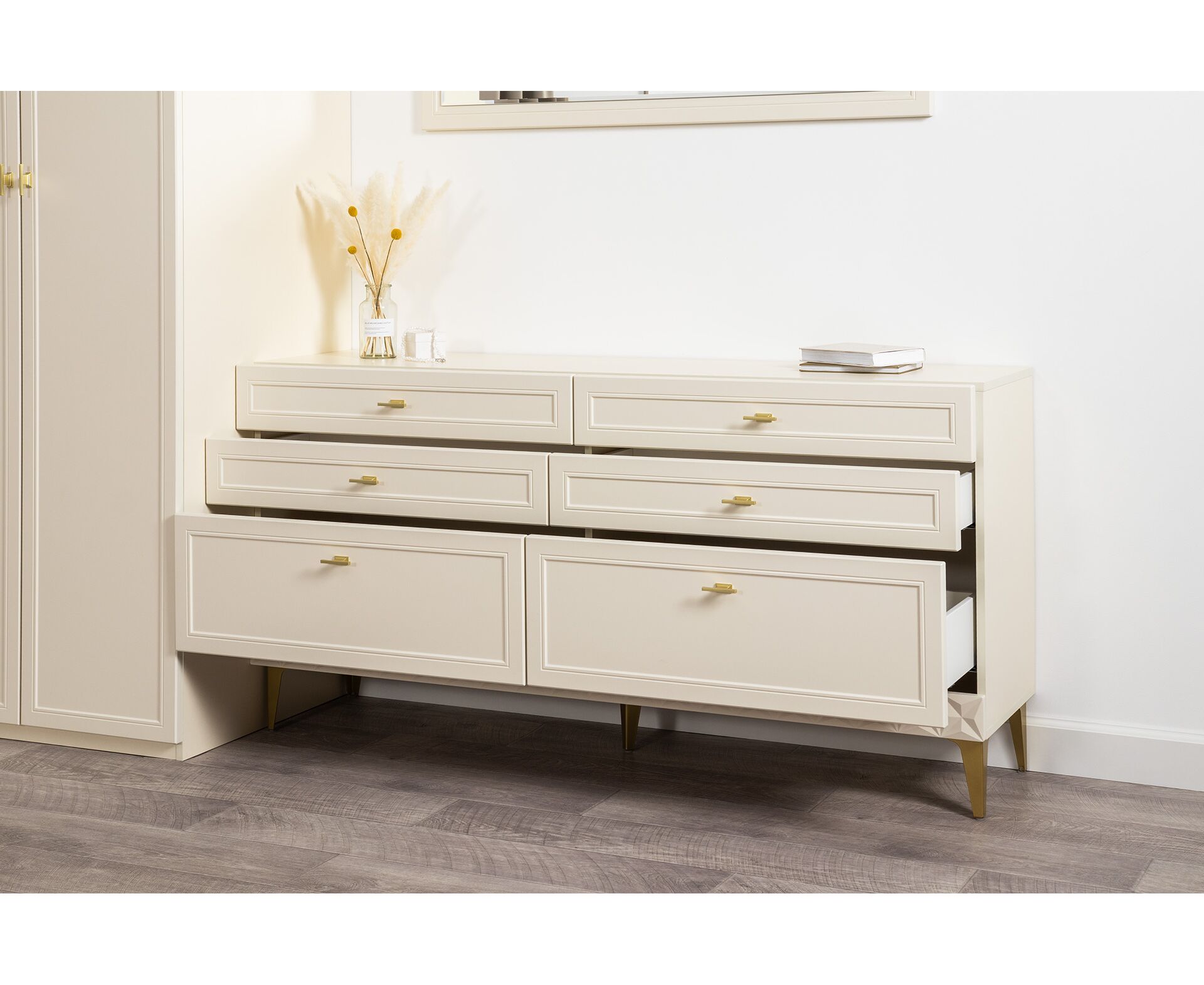 Изящные линии, глубокая фрезеровка фасадов из МДФ и благородные оттенки. Утончённая «Слоновая кость» и изысканная «Олива Шагрень» с глубоким зелёным тоном — создают атмосферу уюта, тепла и благородства. Металлические ручки и опоры золотого цвета придают мебели утончённый блеск, а петли и направляющие с доводчиками обеспечивают плавное и бесшумное закрытие фасадов.