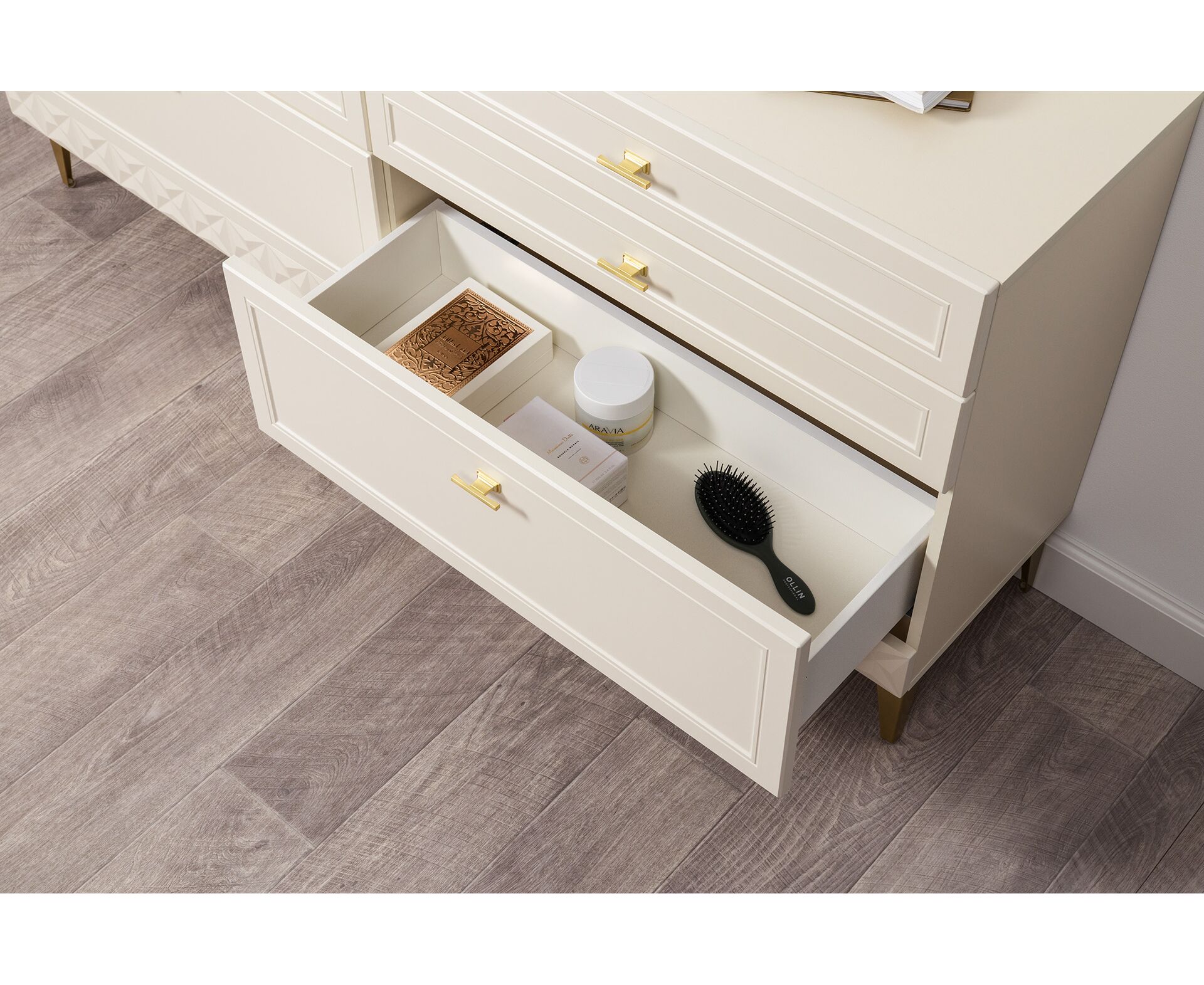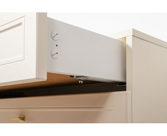 Изящные линии, глубокая фрезеровка фасадов из МДФ и благородные оттенки. Утончённая «Слоновая кость» и изысканная «Олива Шагрень» с глубоким зелёным тоном — создают атмосферу уюта, тепла и благородства. Металлические ручки и опоры золотого цвета придают мебели утончённый блеск, а петли и направляющие с доводчиками обеспечивают плавное и бесшумное закрытие фасадов.