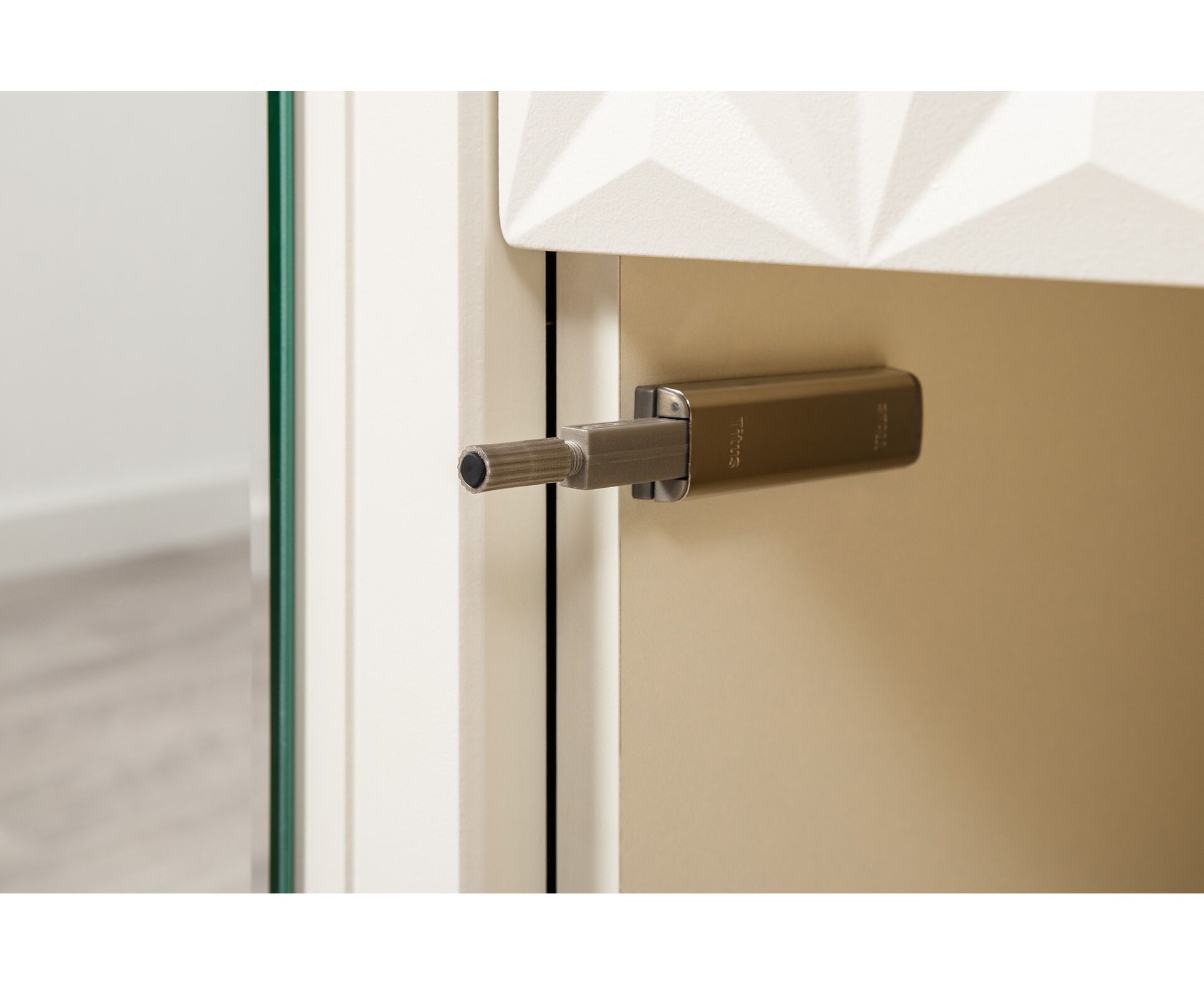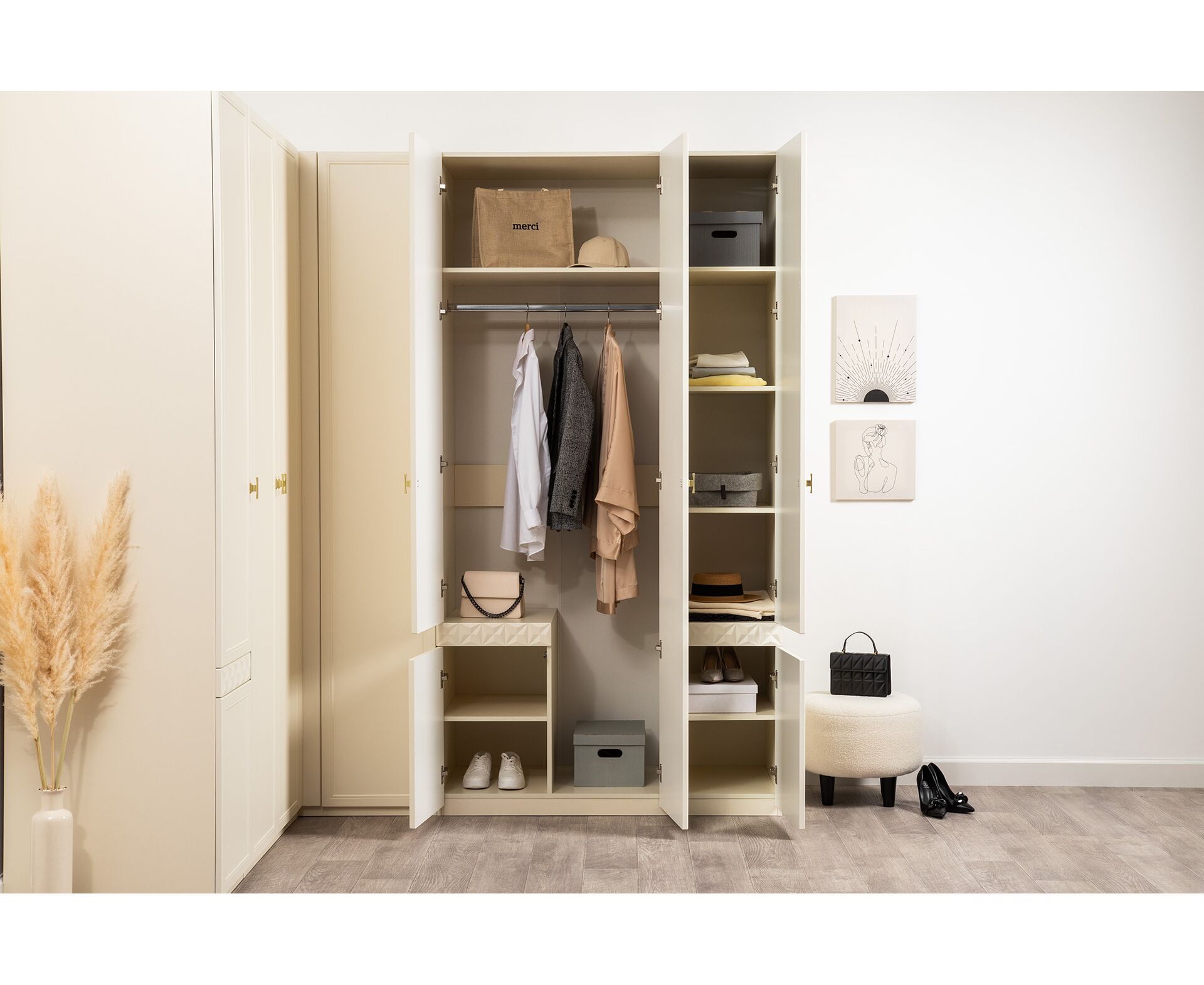 Изящные линии, глубокая фрезеровка фасадов из МДФ и благородные оттенки. Утончённая «Слоновая кость» и изысканная «Олива Шагрень» с глубоким зелёным тоном — создают атмосферу уюта, тепла и благородства. Металлические ручки и опоры золотого цвета придают мебели утончённый блеск, а петли и направляющие с доводчиками обеспечивают плавное и бесшумное закрытие фасадов.