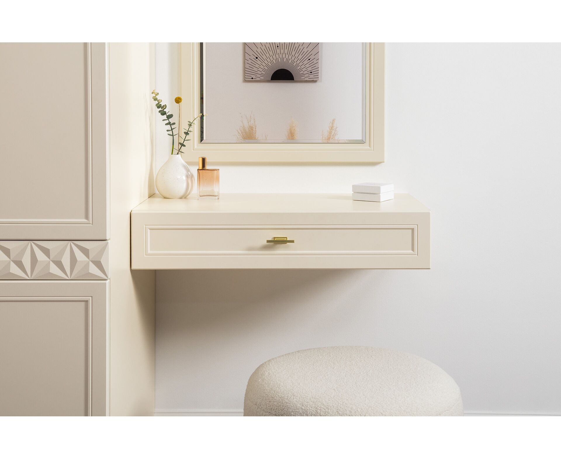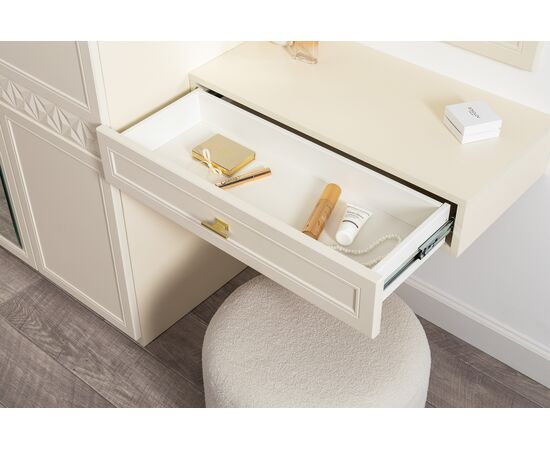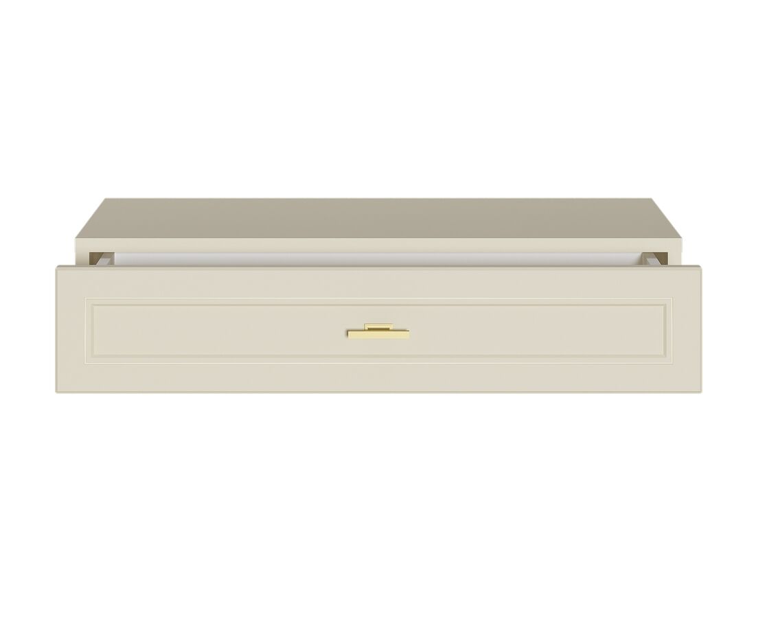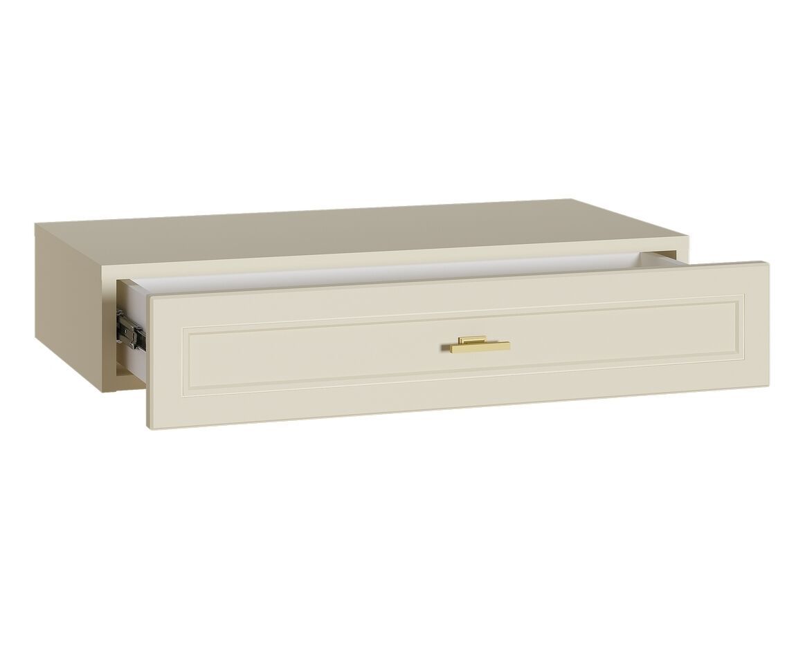 Изящные линии, глубокая фрезеровка фасадов из МДФ и благородные оттенки. Утончённая «Слоновая кость» и изысканная «Олива Шагрень» с глубоким зелёным тоном — создают атмосферу уюта, тепла и благородства. Металлические ручки и опоры золотого цвета придают мебели утончённый блеск, а петли и направляющие с доводчиками обеспечивают плавное и бесшумное закрытие фасадов.