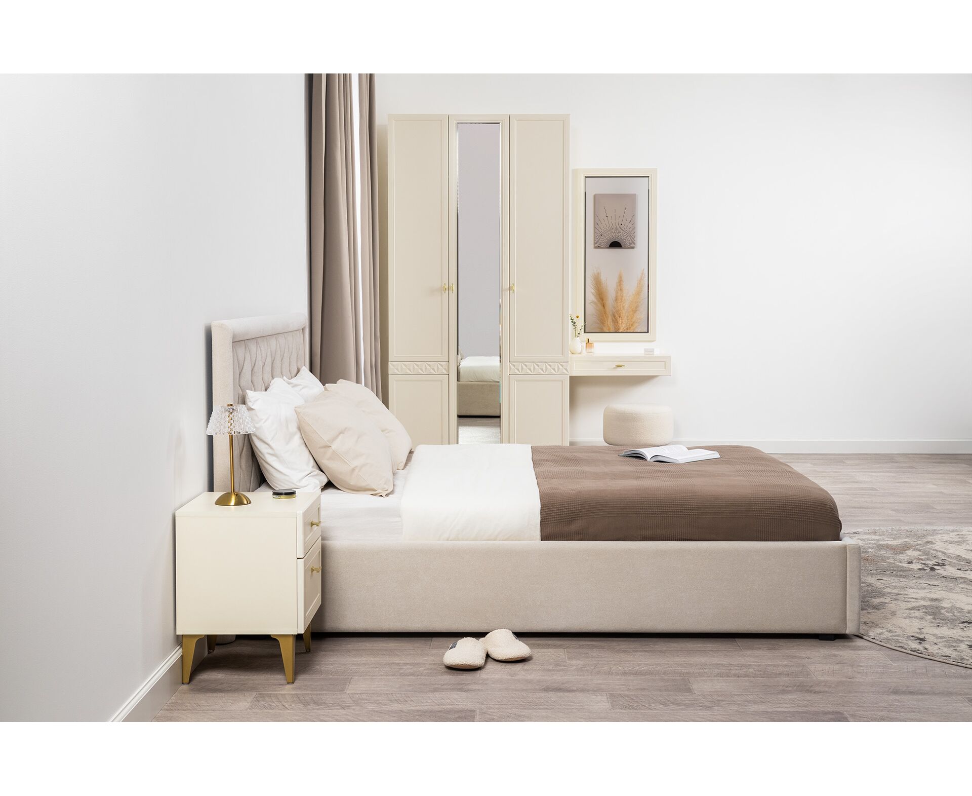 Для спальни предусмотрены гардеробная система, комоды, консольный стол и прикроватная тумба.