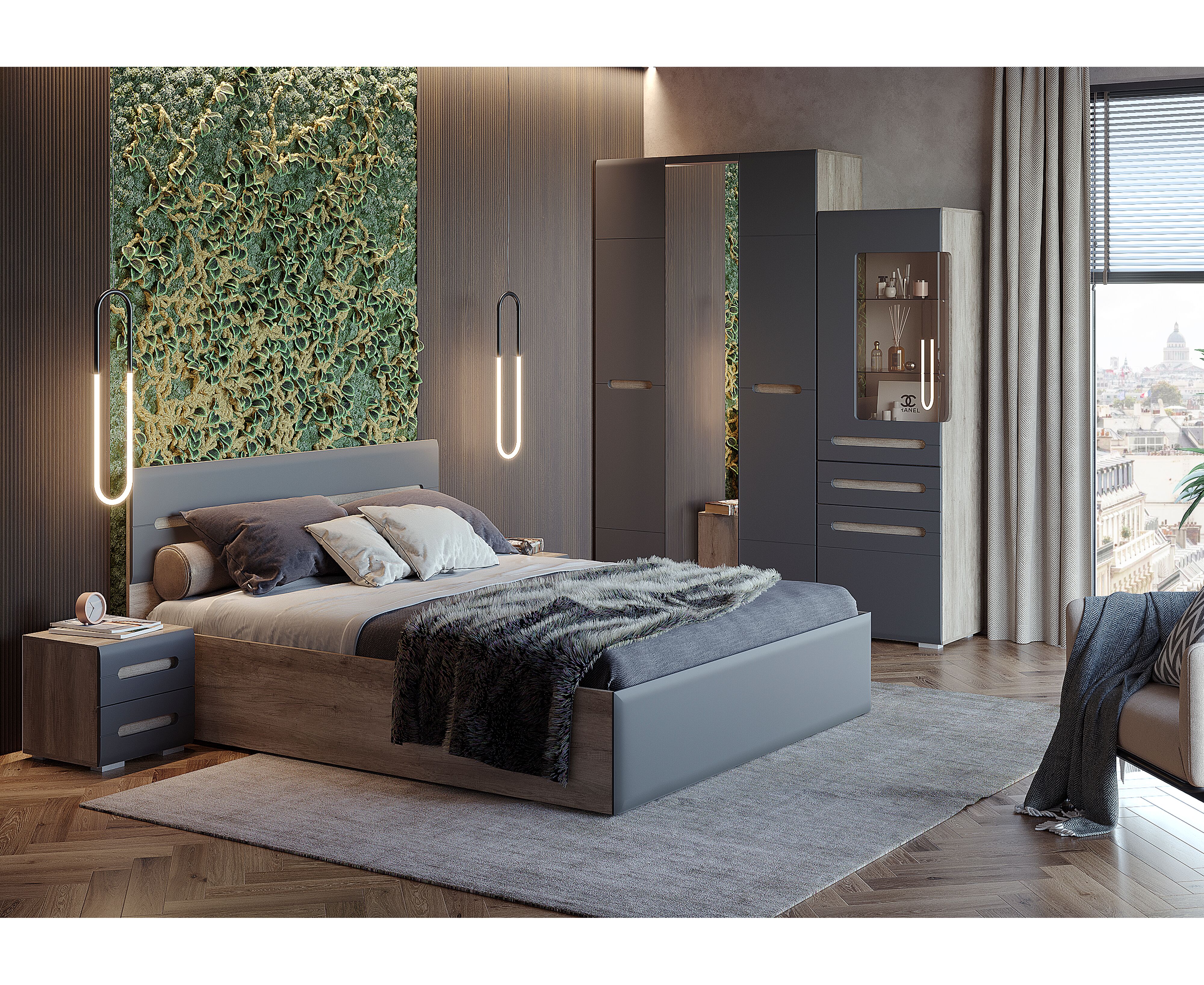Модульная коллекция «Наоми» – это стильное современное решение в контрастном сочетании корпуса «дуб каньон» с элегантным матовым фасадом насыщенного грифельного оттенка. Оригинальное конструктивное решение коллекции – ручки фасадов, выполненные путем сложной фрезеровки с максимально реалистичным декором дубового спила.