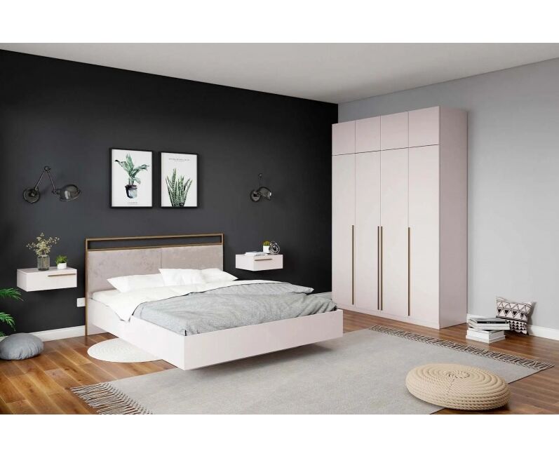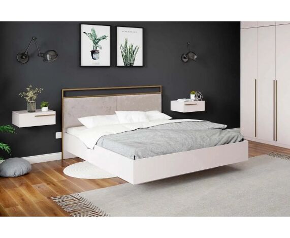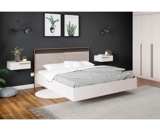 Спальный гарнитур Николь, изготовленный в современном стиле - это стильный акцент вашего интерьера. Уникальная парящая кровать с мягкой вставкой в изголовье - модный тренд оформления спальни. Выглядит легко и стильно, особую изюминку придает металлическая окантовка изголовья.