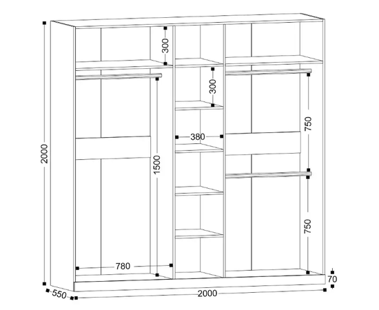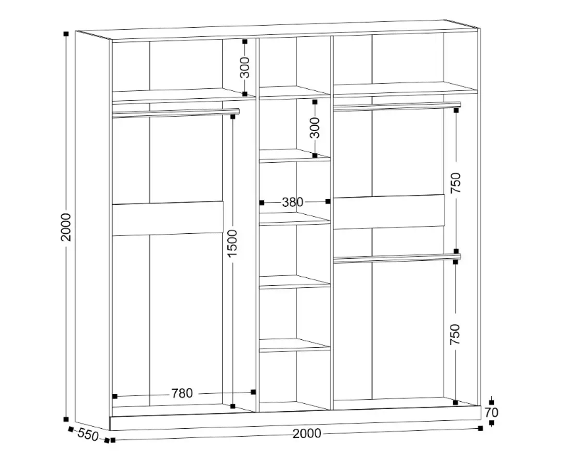 Также есть варианты шкафа с антресолью высотой 40 см (общая высота шкафа 240 см) или с антресолью 60 см (общая высота шкафа 260 см) .