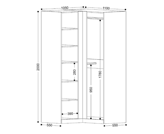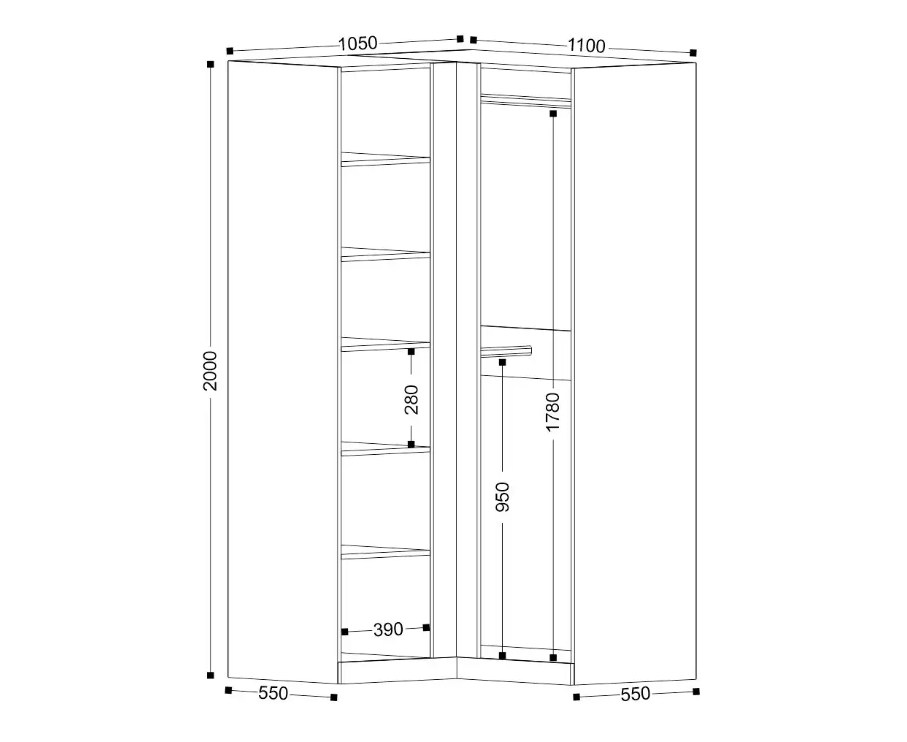 Вместительный угловой шкаф Николь-27 с двумя створками превращает неприметные уголки комнаты в просторное хранилище. Позволяет разместить значительно больше вещей, чем стандартные прямые модели. Оборудован штангами и полками.