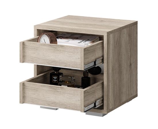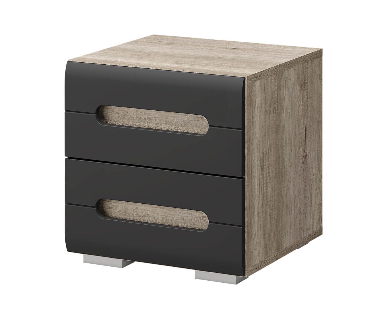 Стильная прикроватная тумба "Наоми" дополнит вашу спальню. Ручки интегрированы в фасады двух выдвижных ящиков. Комбинация темного цвета и цвета "дуб каньон" позволит тумбе стать частью современного интерьера.