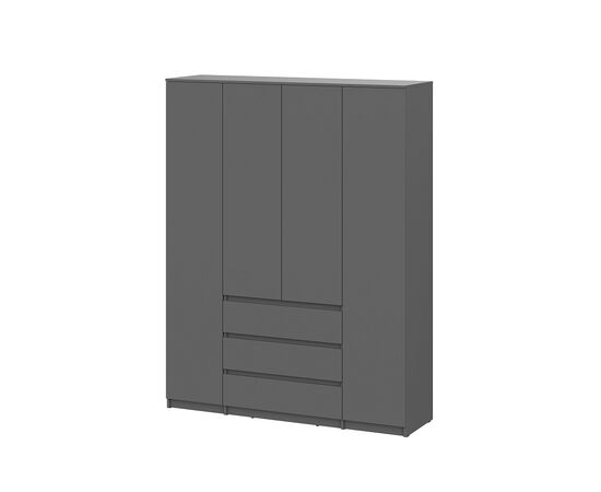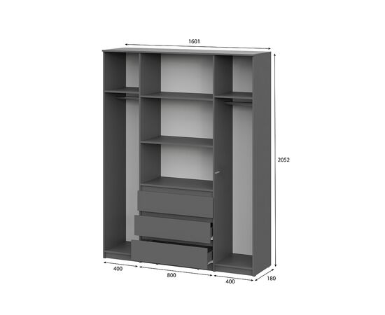 Шкаф Денвер четрехстворчатый с ящиками имеет 2 платяных отделения со штангами для одежды на вешалках, полки по центру шкафа и 3 выдвижных ящика на роликовых направляющих.