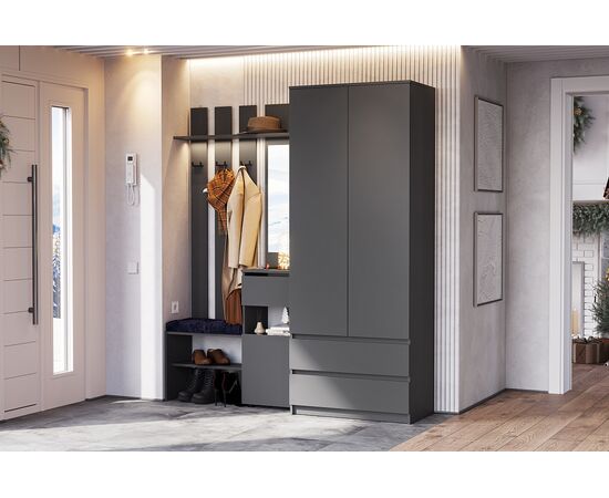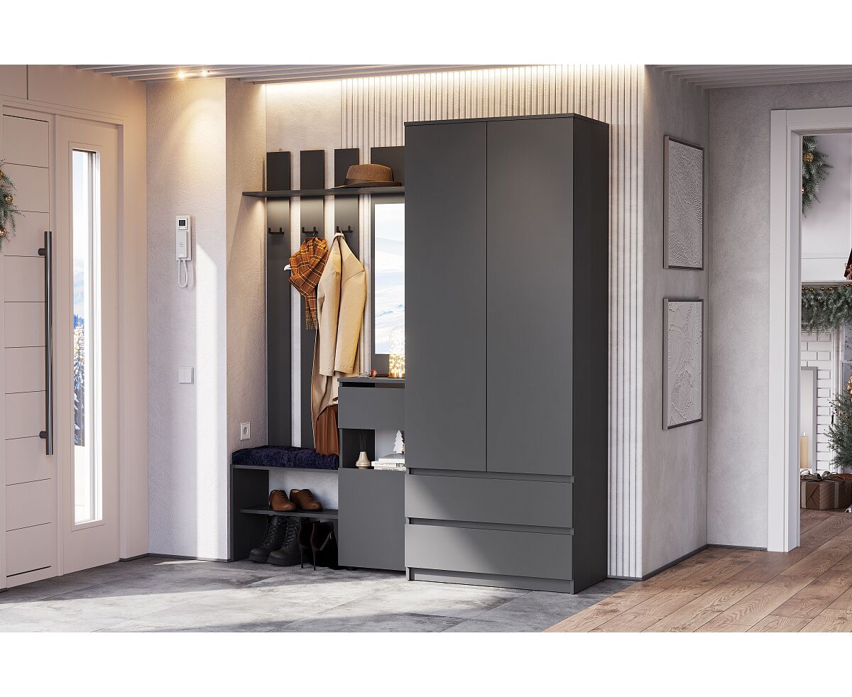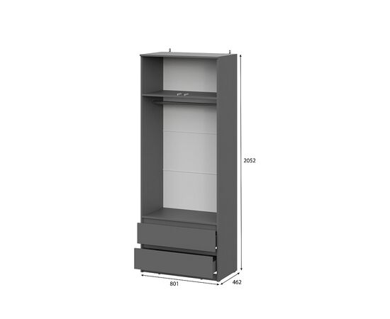 Шкаф Денвер двухстворчатый с ящиками имеет штангу для одежды на вешалках и 2 выдвижных ящика на роликовых направляющих.