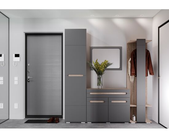 Модульная коллекция «Наоми» – это стильное современное решение в контрастном сочетании корпуса «дуб каньон» с элегантным матовым фасадом насыщенного грифельного оттенка. Оригинальное конструктивное решение коллекции – ручки фасадов, выполненные путем сложной фрезеровки с максимально реалистичным декором дубового спила.