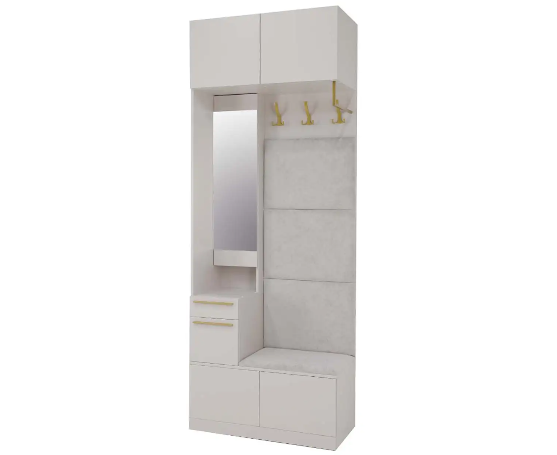 Представляем прихожую Николь в суперсовременном цвете ЛДСП Кашемир. Модули коллекции включают в себя элегантное зеркало с фацетом, удобный ящик для мелочей, отделения для обуви и мягкие элементы, чтобы создать идеальное пространство для вашей прихожей, а также двустворчатый шкаф и пенал.