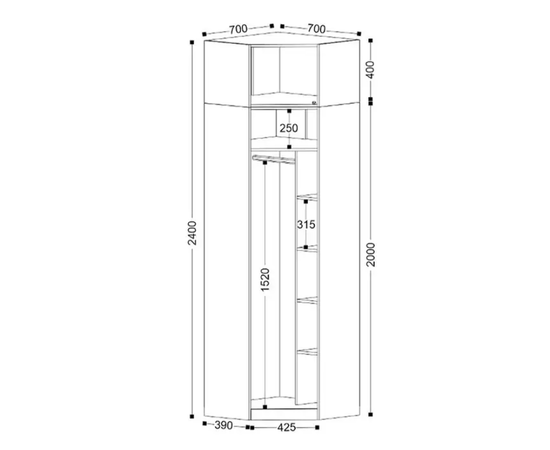 Угловой шкаф Николь-26 идеально впишется в современную прихожую. Функциональный шкаф со штангой и полками позволит грамотно разместить большой объем вещей, не занимая много места в комнате.