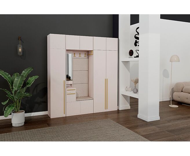 Данный модуль можно дополнить элементами из этой коллекции, а именно: большой и малой тумбой для обуви, пеналом, 2-створчатым и угловым шкафами.