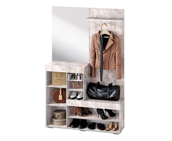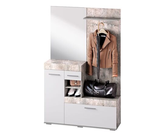 Небольшая, но стильная модель "Инстайл" станет прекрасным выбором для решения хранения в прихожей. Сочетание белого матового и фактуры бетона, а также наличие большого зеркала облегчают конструкцию и позволяют ей расширить пространство. Все створки, за которыми спрятаны полки для хранения вещей и обуви, оснащены эргономичными хромированными ручками.
