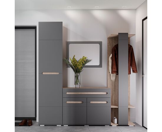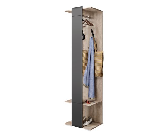 Напольная вешалка "Наоми" – практичное решение для небольшой прихожей. Функциональная модель оснащена всем необходимым для удобного хранения предметов гардероба, обуви и сопутствующих аксессуаров. Обратите внимание! Вешалку необходимо крепить к стене при помощи угловых навесов. Фурнитура входит в комплект. Изделие состоит из хромированный штанги для вешалок, крючков и полки. Фасад из МДФ оттенка "графит"добавляет вешалке стиля.