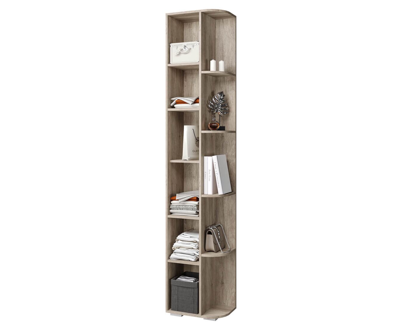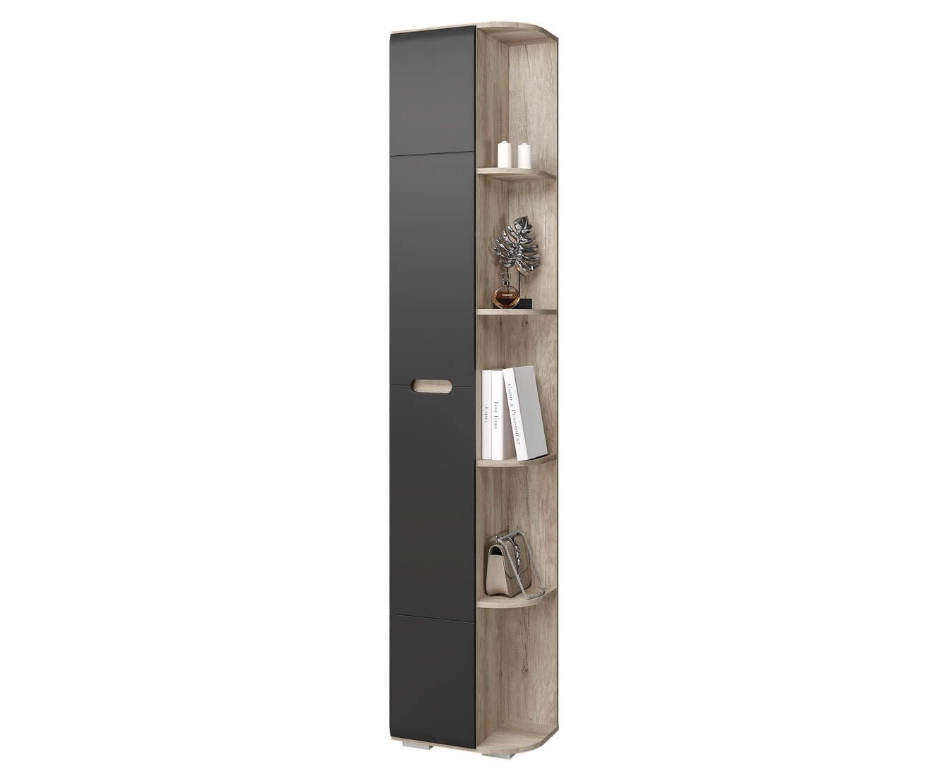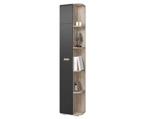 Пенал "Наоми" не только организует хранение в любой комнате вашей квартиры. Благодаря угловому завершению с открытыми полками, в нем можно разместить необходимые предметы декора, которые должны быть на виду. Темные фасады дверцы, встроенная ручка и корпус в цвете "дуб каньон" позволит изделию вписаться в современный интерьер.